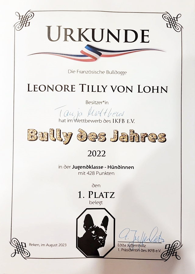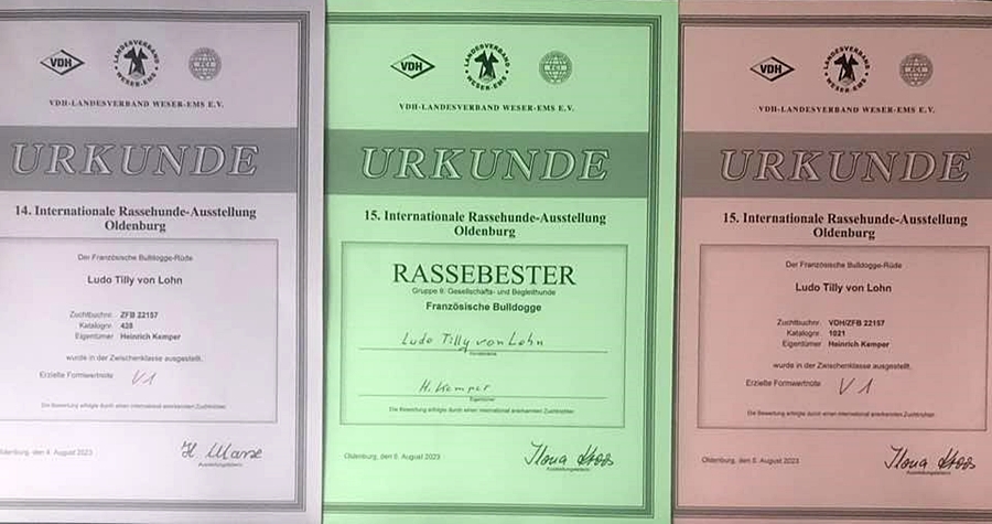 Nun ist es offiziell, Hellen-Sophie Tilly von Lohn ist Deutscher Champion VDH & IKFB, mehr auf ihre Seite unter Hündinnen, wir freuen uns riesig